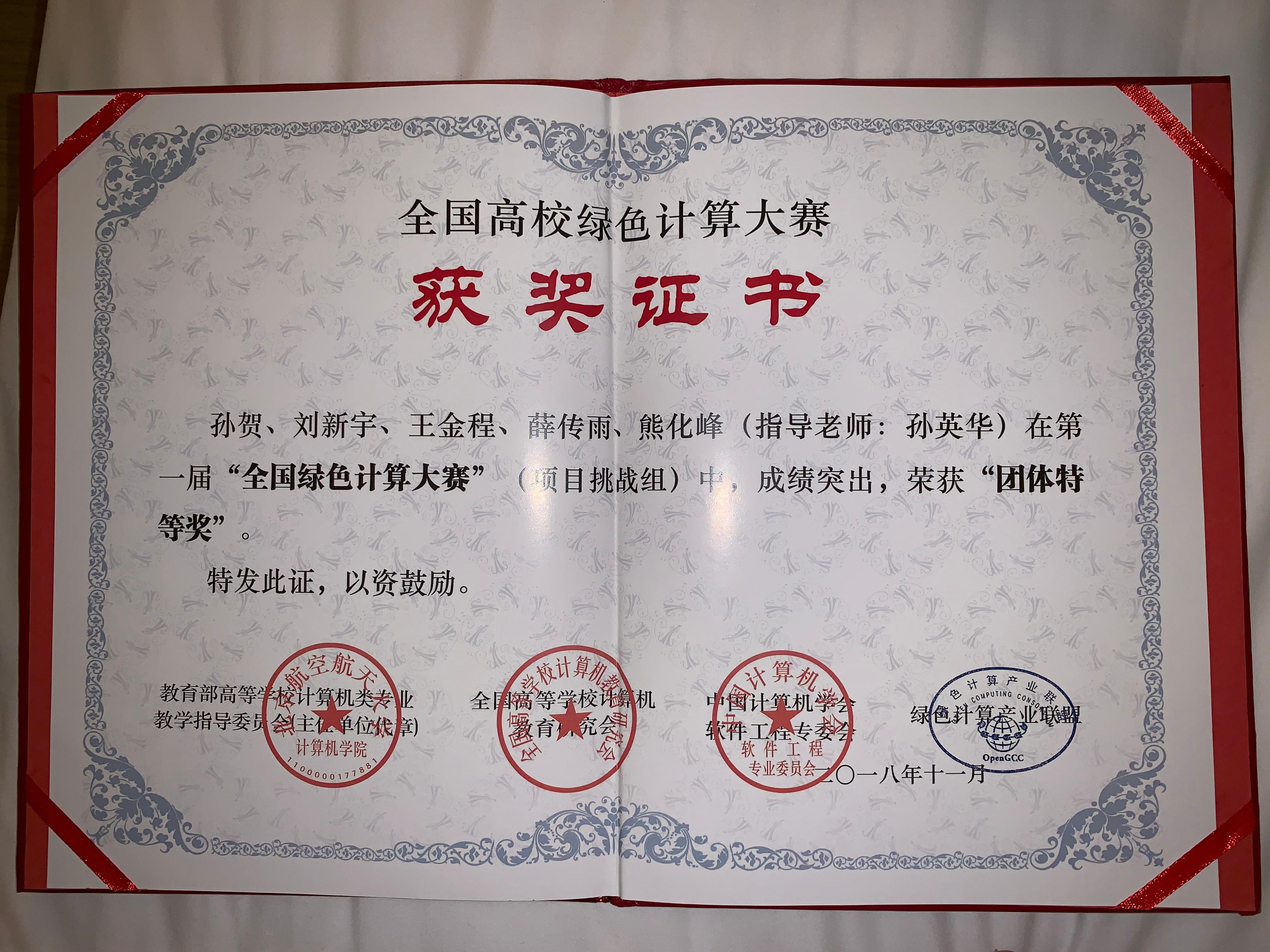 11月25日,首届“全国高校绿色计算大赛”在深圳大学颁奖,孙英华副教授指导、本科生刘新宇、薛传雨、王金程、孙贺和研究生熊化峰组成的参赛队参加“项目挑战组”比赛,总成绩排名全国第3位,团体和个人均荣获全国特等奖。