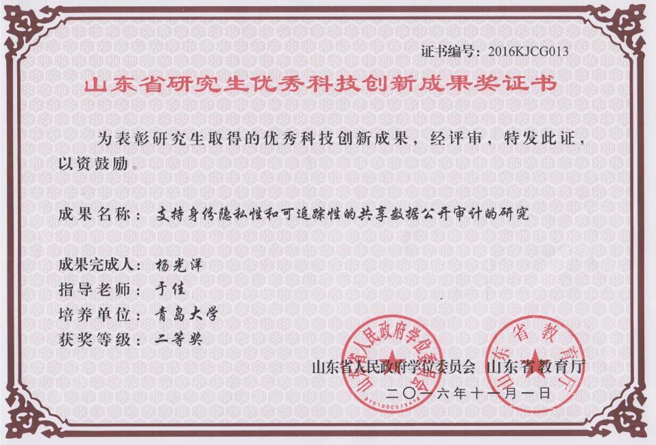 2016年山东省优秀学位论文、研究生优秀科技创新成果奖和实践成果奖评审已经结束。伦理电影 2013级研究生杨光洋的“支持身份隐私性和可追踪性的共享数据公开审计的研究”荣获山东省研究生优秀科技创新成果二等奖,指导教师为于佳教授。