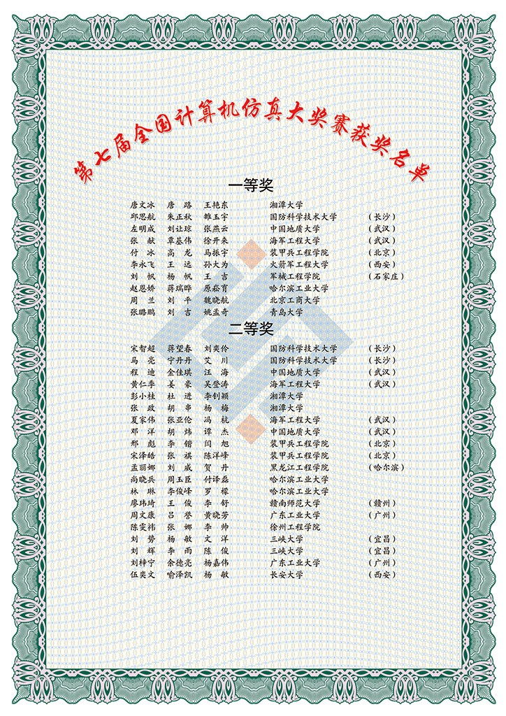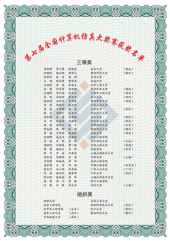 全国计算机仿真大奖赛由教育部高教司、中国自动化学会、中国计算机用户协会、中国系统仿真学会、中国指挥与控制学会联合主办。大赛每两年举办一届。每届比赛的国家级一、二、三等奖共60个名额,竞争激烈。在本届比赛中,有近百所高校的逾千支队伍参赛,参赛人员涉及本、硕、博多个层次。