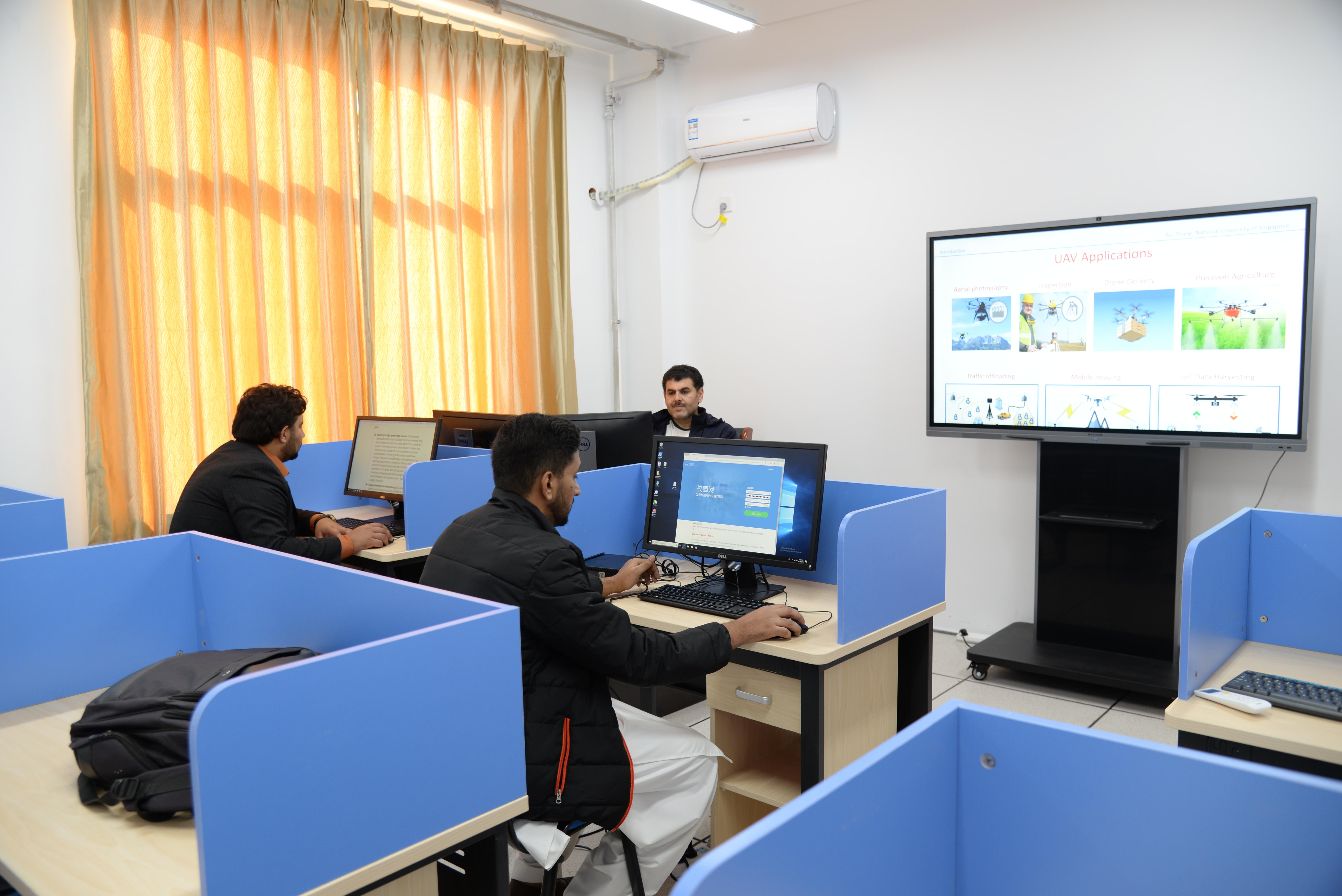 巴基斯坦籍特聘教授曼祖尔.艾哈迈德博士和他的外籍研究生在工作室工作。