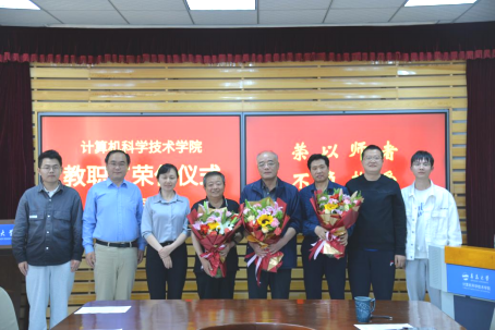 潘秋鸿和郭振波为荣休教职工代表送上鲜花和伦理电影定制的纪念品。周鹏宣读了2023年第一批退休教职工名单。