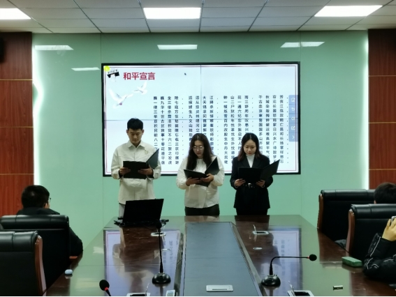 同学们共同回顾了日军制造“南京大屠杀”的历史事件和其犯下的罪行。随后,于欣洋、邓雨昂、王一旻朗读《和平宣言》,向大家呼吁要铭记革命先烈与侵略者抗争的英勇事迹,要传承红色基因、弘扬爱国精神,共同维护和平、捍卫正义。