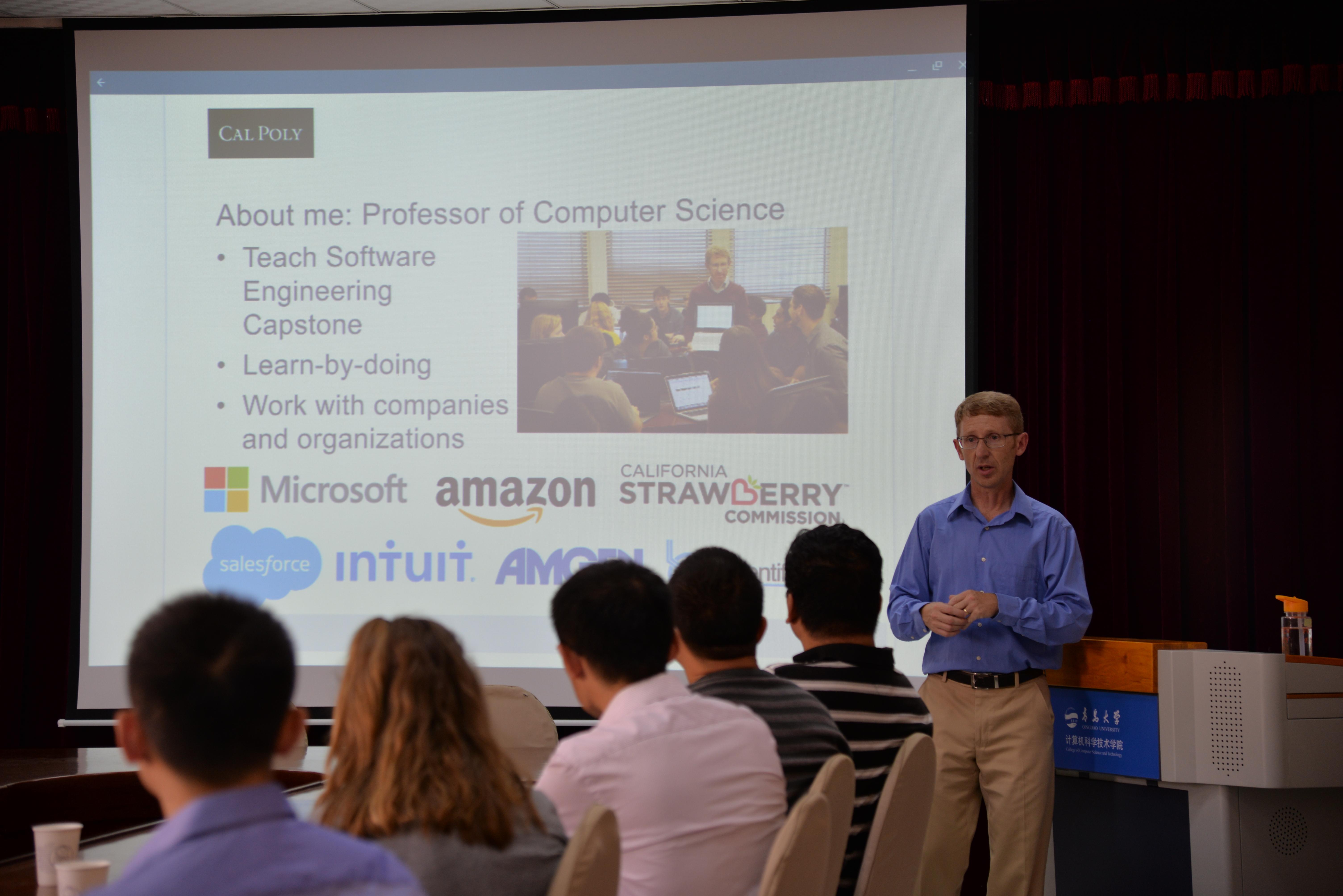 David教授简要介绍了自己任职的加州州立理工大学的情况,介绍了自己开发的软件产品,以及如何才能使得技术团队合作保持高效,最后通过跟学生们互动的方式讲解了通过每天的站立会议和头脑风暴会促进团队合作以及软件产品的开发效率。