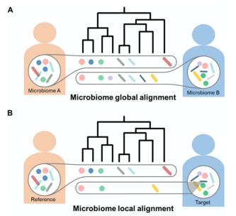 图1. 微生物组beta多样性距离计算的(A)全局比对模式与(B)局部比对模式