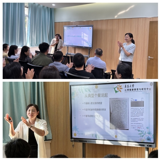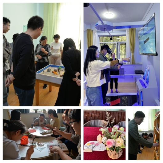 心理健康教育与研究中心主任米振宏首先向老师们介绍了中心秉承的工作理念用专业温暖每一个心灵,让生命在此绽放,然后带领老师们有序参观了预约接待室、艺术治疗室、团体活动室、VR训练室、沙盘游戏室、心理测评室、宣泄室等功能室。米主任结合自身工作经验从心理学入手,列举典型案例,深入浅出地讲解了师生心理健康的重要性以及青少年常见心理问题及应对,亲切又富有感染力的讲解引起了大家的情感共鸣,对于老师们在处理学生常见心理问题及人际关系矛盾的问题上有很大的帮助。讲座结束后,老师们详细观摩并体验了插花、绘画、沙盘、SWITCH等相关功能室及活动。